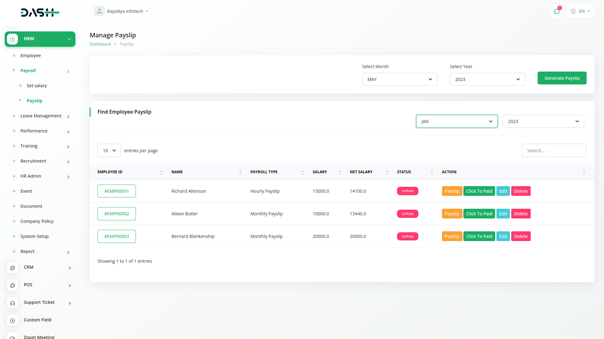 You can generate monthly payslips and make bulk payments through easy clicks. You could also change the status of the payslip with an easy CTA. An employee could view the breakdown of their salary components.